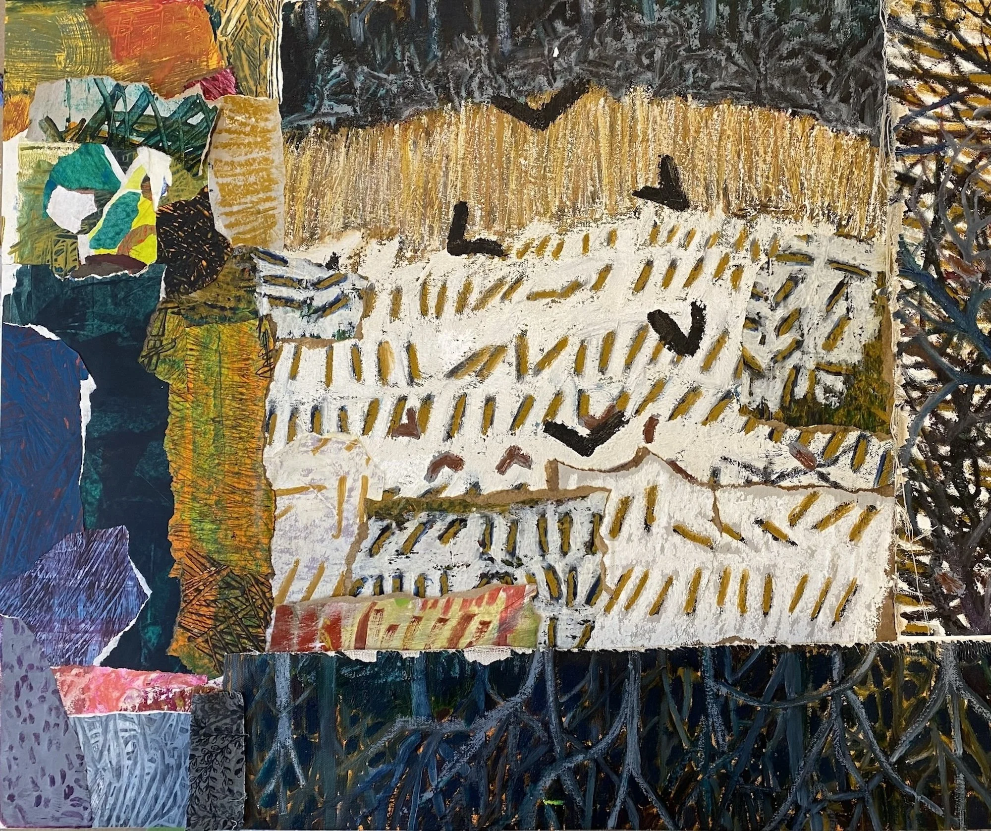 Winter Crows, Great Brook Farm, mixed media on cradled board, 24 x 30, 2025